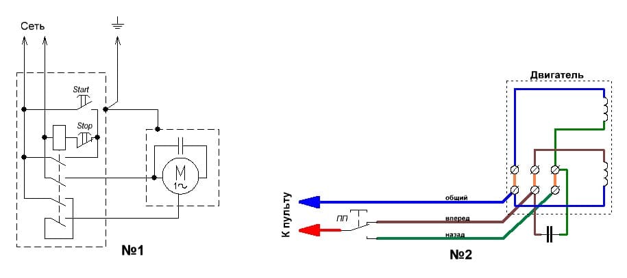Вот Ваша схема (№1) и схема добавления переключателя (при желании получить реверс) (№2) ...maxlinder писал(а):Источник цитаты ...,напишите что мне нужно для такого блока под мой двигатель....