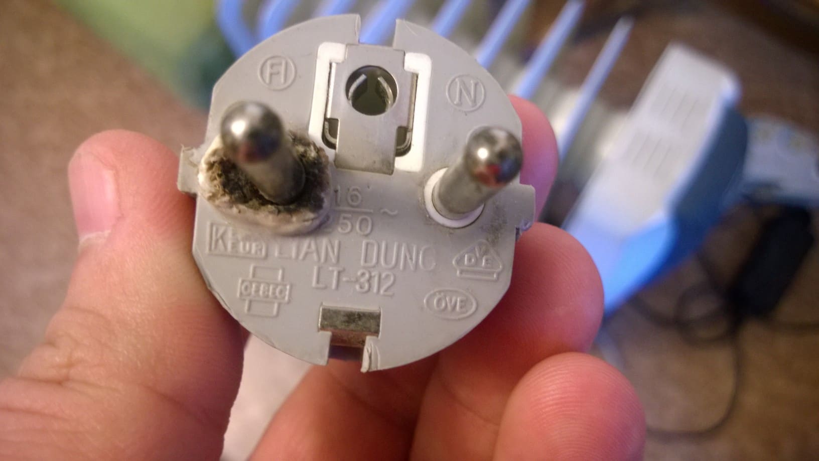 Вот что с вилкой оказывается. Это еще когда дед втыкал его в ту розетку, что напрямую была подсоединена.(( Оплавленный штырь еще и болтается. Похоже буду вилку сейчас менять. Странно, почему я раньше этого не заметил.(