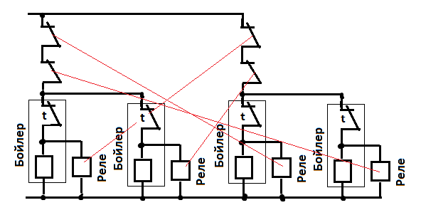 стоят 4 бойлера по 2 квт. каждый, имеется одна линия на 4 квт, как сделать так, чтобы как только два нагрелись - отключились (в каждом терморегулятор), два других включились (до полного нагрева) и опять по кругу??? :pardon: