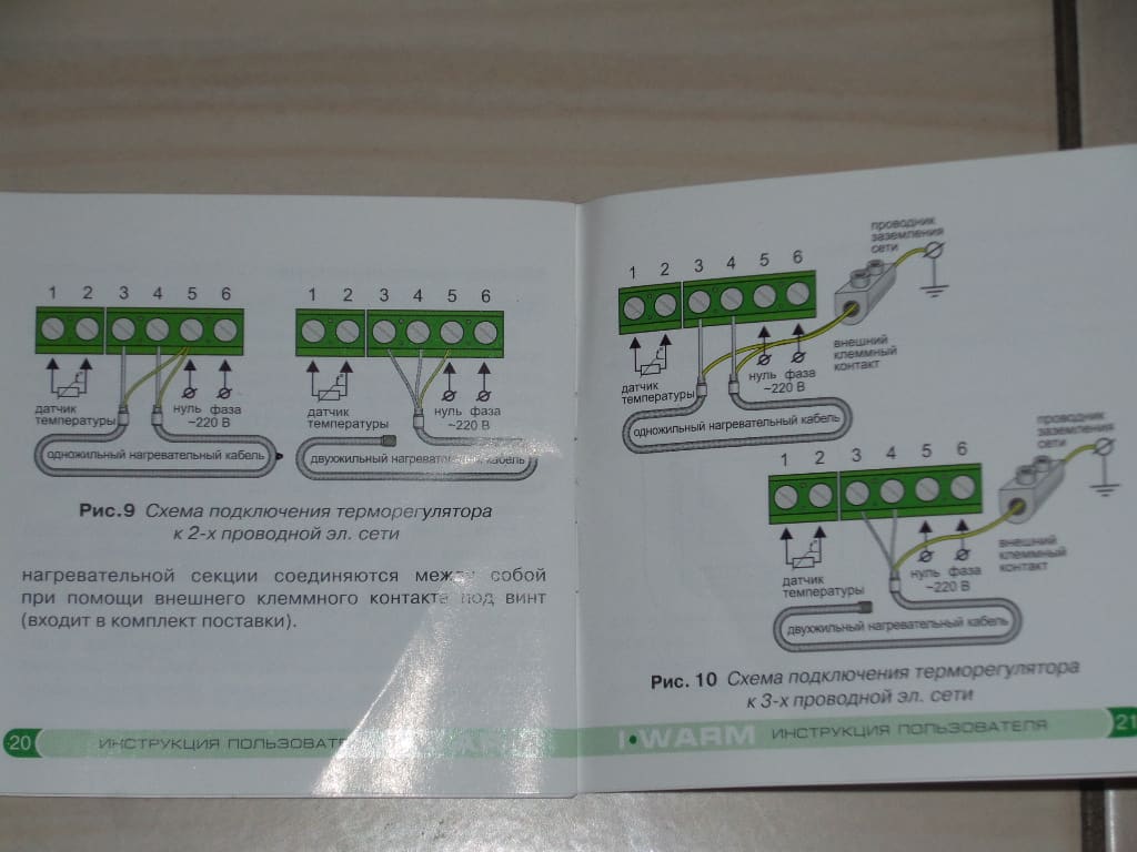 А N проводник цел? Вам не индикаторной отверткой надо проверять, а мультиметром ну или прибором его аналога. Найдите исправный мультиметр или купите себе новый. Постав те ручку управления в режим измерения переменного напряжения и проверьте наличие сигнала в 220в на входящих клемм терморегулятора(6-5). Если есть то перевидите терморегулятор в положение включено и проверите выходящий сигнал в 220в у клемм для теплого пола(4-3). Если также есть то причина в целостности самого греющего элемента. Для его проверке перевидите мультиметр в режим измерения сопротивления заранее отсоединив греющий элемент от терморегулятора и протестируйте греющий элемент цел ли он и не закорочен ли на РЕ(Экран и мелкой проволоки )