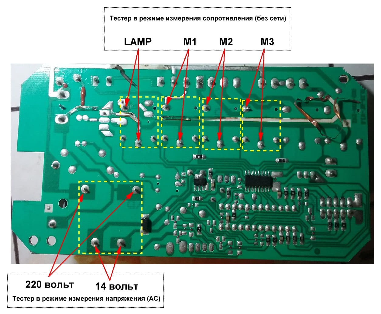 Тестером замерьте сопротивление катушек всех реле (В СЕТЬ НЕ ВКЛЮЧАТЬ!) ... точки подключения щупов указал стрелками.Дмитрий 1 писал(а):Источник цитаты ... как проверить реле ?