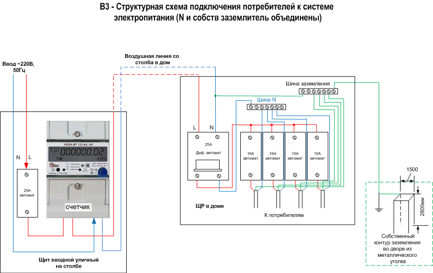 Сечение примененного кабеля не позволяет (ПУЭ) применять систему TN-C-S, по версии Вашей схемы (В3).Кабель до фасада дома протянут по воздуху алюминиевыми проводами (около 10м, сечение 4-6мм, точно не скажу).