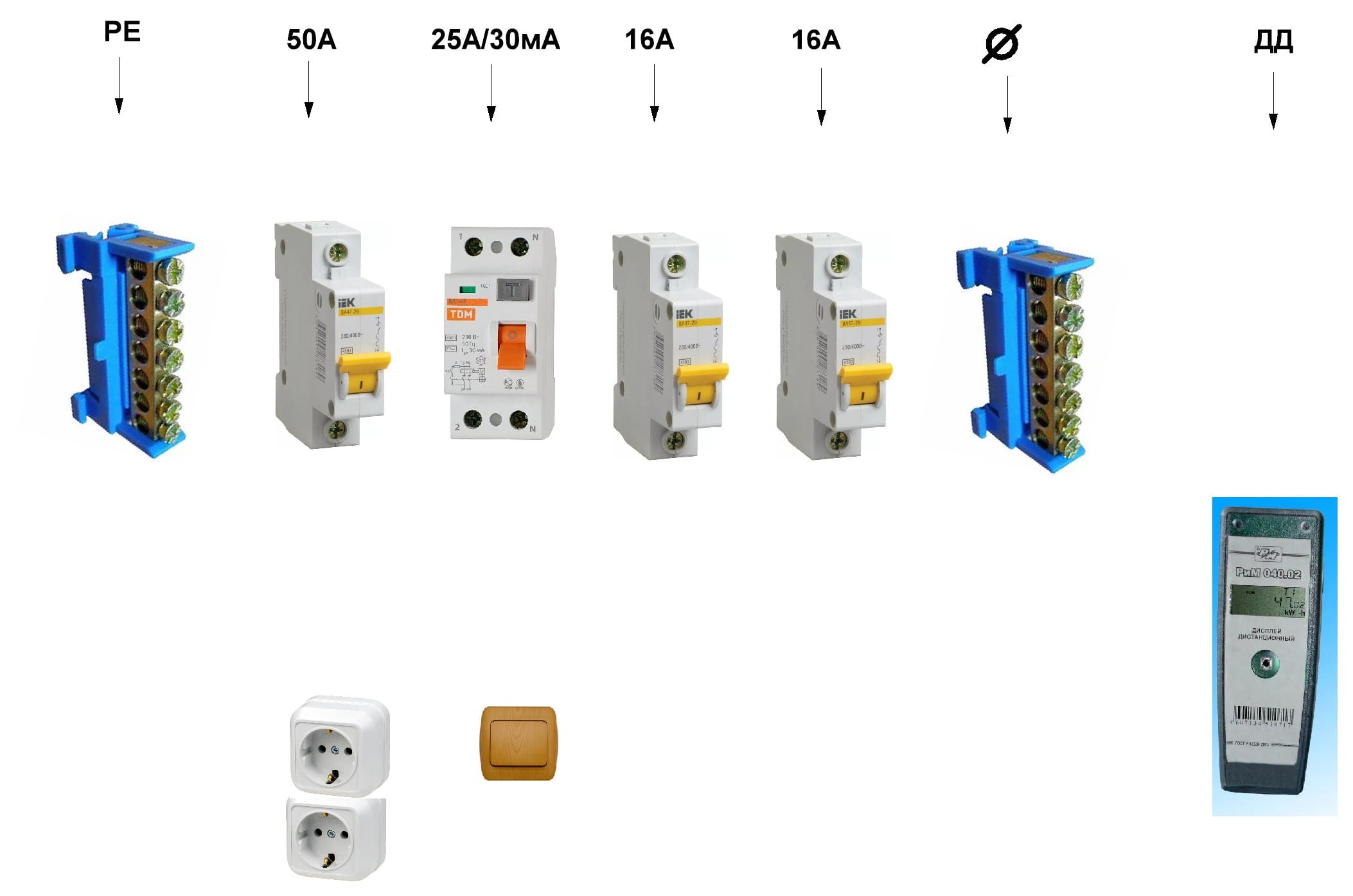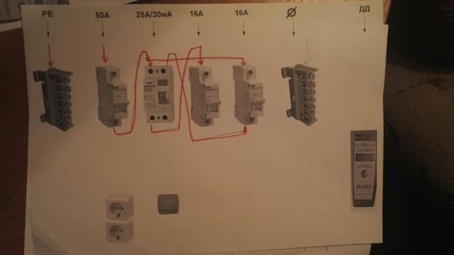 У Вас всё перед глазами ... соедините (нарисуйте) на выложенном мной рисунке, проводами автоматы, УЗО, шинки и розетку.