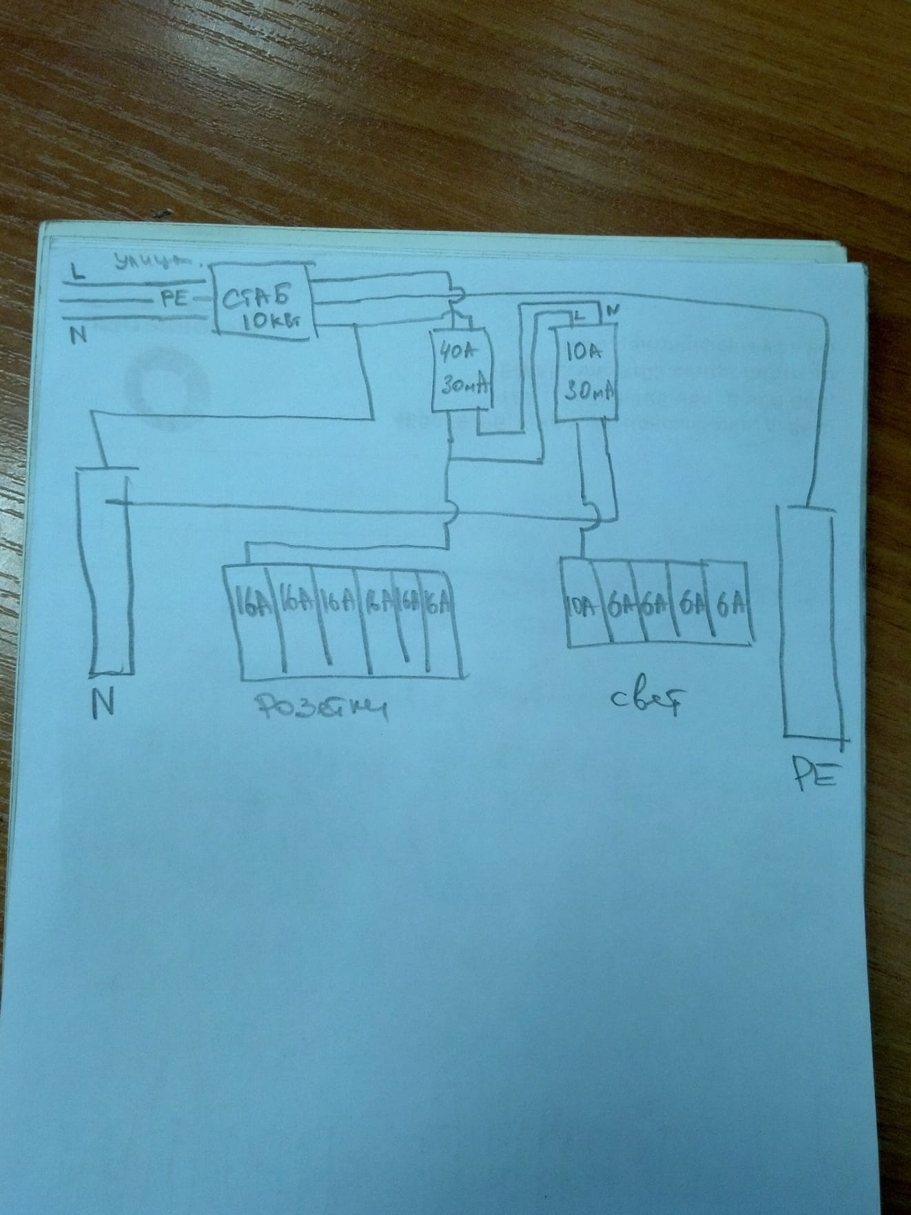 Здравствуйте, помогите советом. Теща купила дом в деревне, приехал открыл шкаф и увидел.Фото1 Заземление делал электрик, вбил прутки 3 штуки 1.5 метровых и провел кабель к стабилизатору. От стабилизатора приход к щитку, счетчик на улице. не выполняли своей функции УЗО, проверял, трогал провод рукой(ну не я сам конечно), током бьет, а УЗО не срабатывает. Решил переделать по своему.Фото 2.Вместо 25 А поставил 16 А, т.к провод на розетках был 2.5, а на свет был 1, поэтому поставил автоматы на 6 А. При включении УЗО на 40 А розетки работали, как только включаю второе УЗО на 10 А , первый вырубает, потом запахло какой то гадостью, и 1 УЗО на 40 А помер. При подключении питания , тест уже не срабатывал. Вот думаю сгорел УЗО. на фото перемычек черных уже нет, это был первый вариант моей замены тоже не работало УЗО, а все соединил, как на схеме.В чем моя ошибка, где я соединил не правильно. за ранее спасибо за помощь.