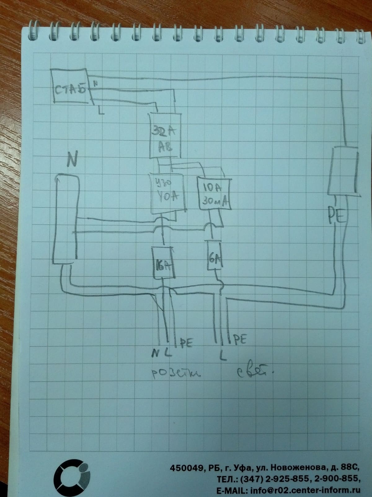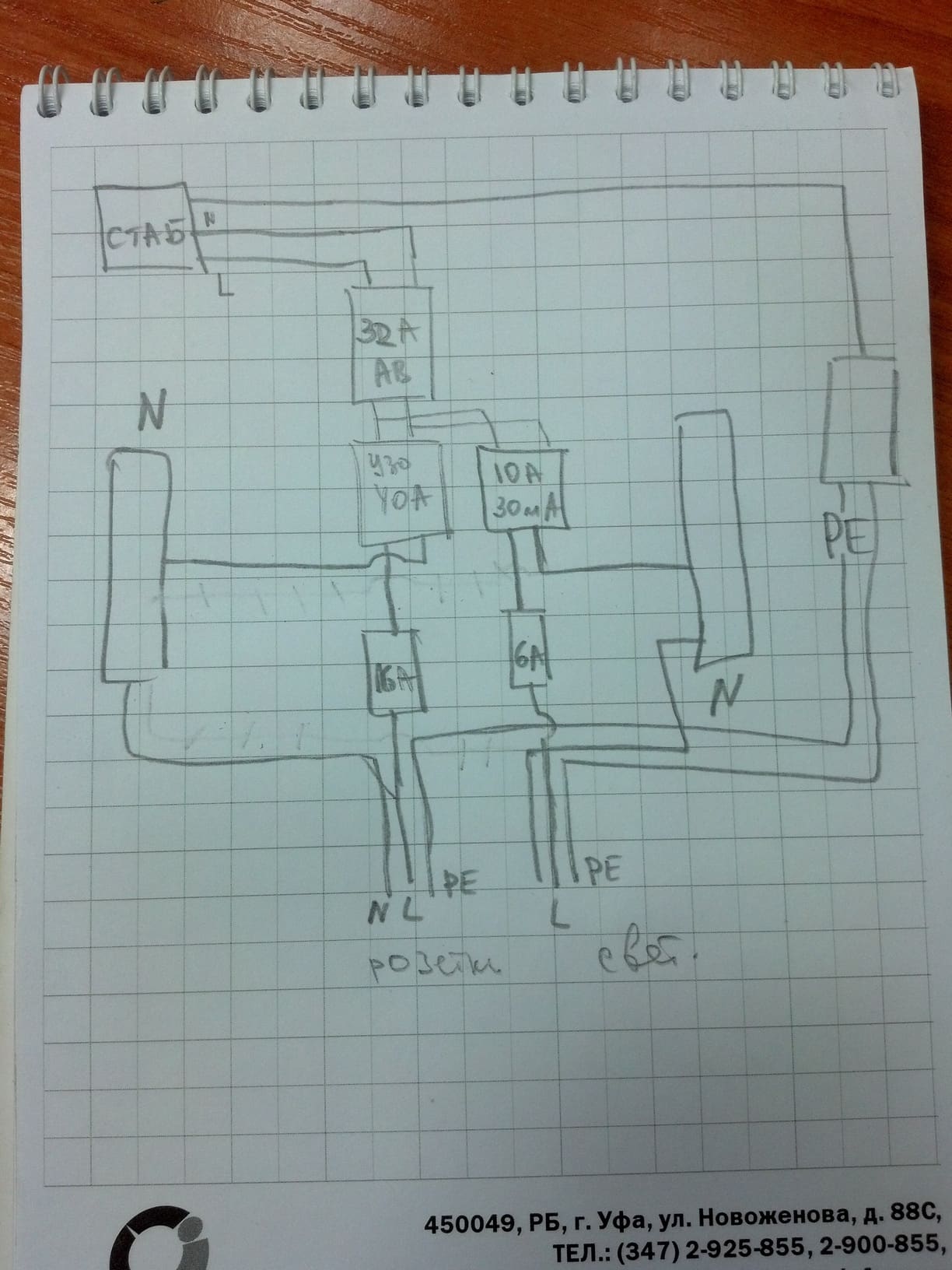 Поменять на больший я не могу, уже ремонт везде почти доделан, нормальный вариант 6 мм.кв, это я знаю. "О" у меня коротыши, если только их всех удлинять, помойка будет, видели же сколько их у меня. Я так понимаю, после стаба нужно ставить автомат на 32 А, но у меня на улице стоит автомат входной на 32 А. Ну если нужно то поставлю, конечно. Нарисовал , как вас понял.
