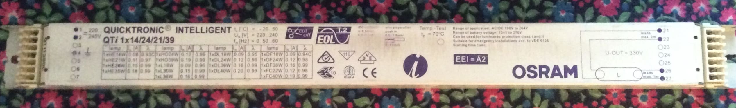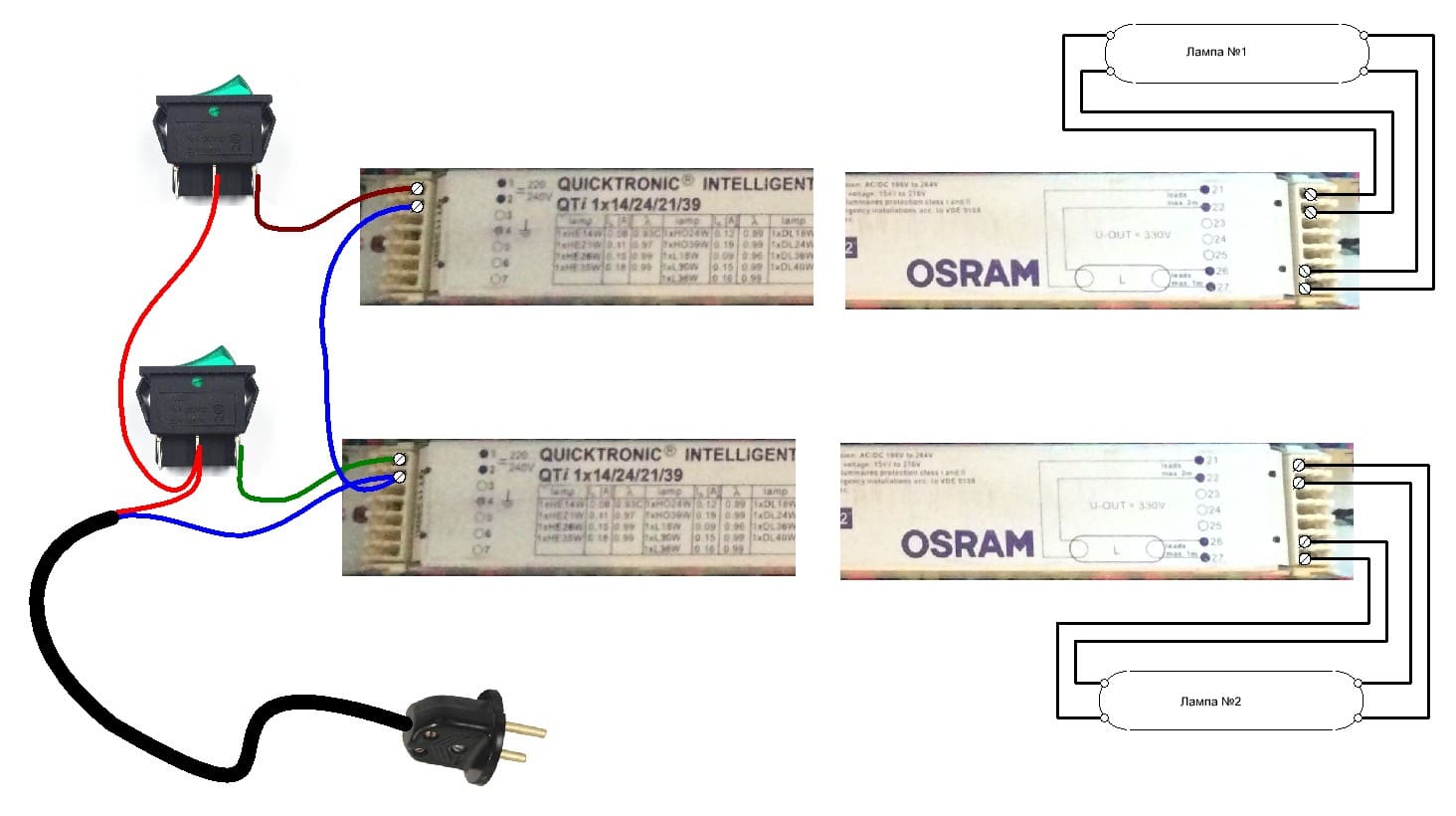 Очень прошу помочь со схемой подключения двух люминесцентных ламп в аквариумной крышке-светильнике. Решил изменить конфигурацию освещения в аквариумной крышке, которую мне изготавливали на заказ сравнительно давно. В этой крышке на данный момент устwановлены две лампы Т5, по 24 Вт каждая, горят только вместе, подсоединены к одной ЭПРА, один выключатель. Необходимо, чтобы лампы запускались по отдельности, каждая через свой выключатель. И самое главное, как грамотно все это соединить воедино: сетевой кабель, два выключателя, две ЭПРА и две лампы Т5. Две другие ЭПРА для этой цели я уже приобрёл. А также жду с Алиэкспресс два выключателя.