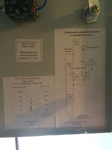АВР связан с генератором: 2 провода на подзаряд АКБ (плюс и минус), 1 провод на "Старт", 1 провод на "Стоп", 1 провод на заземление и с двух розеток генератора нагрузка входит в блок АВР.