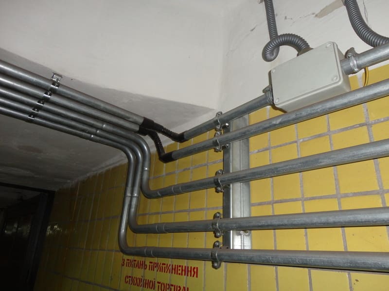 Лично мы проводим в основном в ПВХ гладких трубах от IEK. С применением полной фурнитуры. В целях экономии использую следующею схему. На лестничной клетке устанавливается РЩ. От него идет распределение ответвлений к квартирам в одной большой трубе 40мм или 50мм над каждой квартире устанавливается распределительная коробка в качестве распределительного пункта для ввода в квартиру она и прикрывает отверстие ввода в квартиру и служит люком для протяжки следующих кабелей к другой квартире.