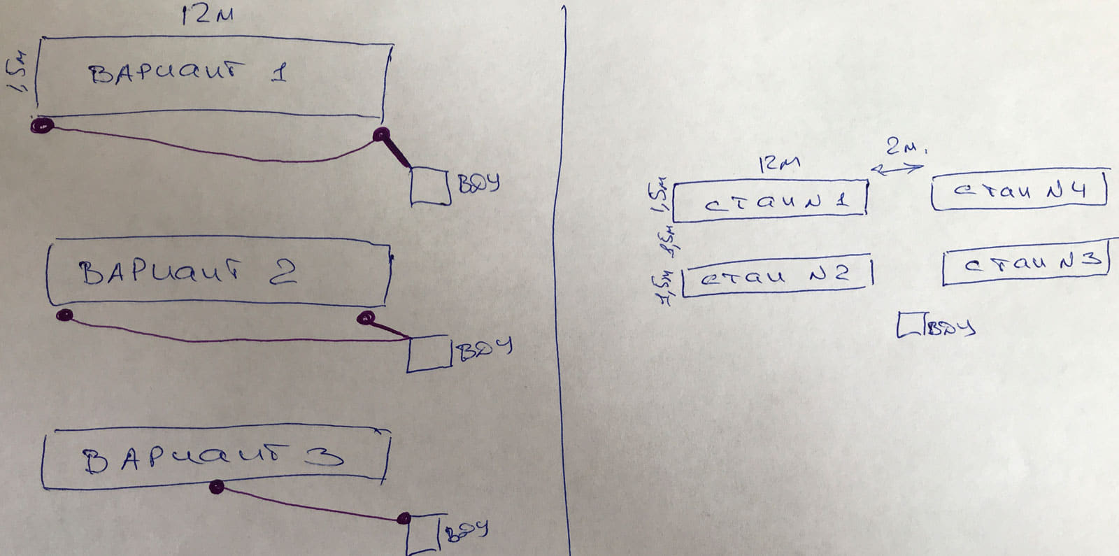 Разошлись во мнении как правильно подсоединить массу к стану длиной 12 метров и какого сечения должен быть этот кабель. Мнения местных электриков разложил на 3 варианта. Фото с тремя вариантами(на рисунке слева) приложил. Посоветуйте по какому варианту правильно. Или может свой предложите? Далее, у меня таких стана 4. Расположены как на рис справа. Как правильно соединить их массой? Кидать к каждому свою по одному из вариантов, которые Вы насоветуете? Или сделать перемычки от одного к другому? И насколько все это отразится на качестве сварного шва?