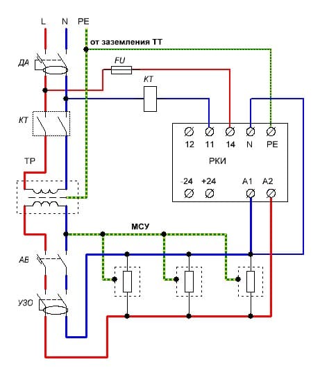 Все оконечные цепи в помещениях Гр2 должны быть защищены от КЗ и перегрузок автоматическими выключателями с одновременным отключением всех фаз, полюсов и нейтрали (использование предохранителей запрещено). В системах IT защита от перегрузок не допускается в питающих линиях (фидерах) до и после разделительного трансформатора.