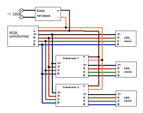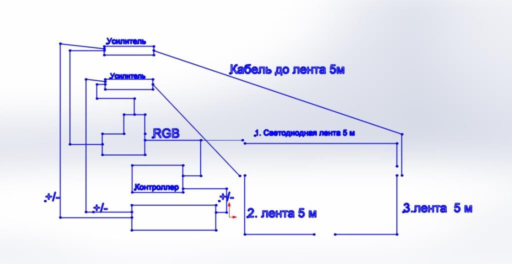 Оставьте подключенным только одну ленту (без усилителя) и проверьте работу контроллера.... одну ленту подключил на прямую к контроллеру две другие через усилитель. Всё подключил как написано в интернете параллельно но у меня все 3 ленты горят разными цветами. Только красный дают все три одновременно, а остальные цвета как попало. Иногда 2 лента отключается а остальные горят. Сменишь цвет 2 снова загорается. В чем проблема я не знаю. Подскажите!!!