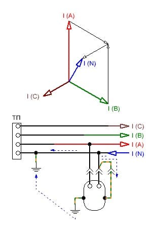 Сверху диаграмма, показывающая природу появления уравнительного тока в нулевом проводе (сдвиг фаз) ... внизу появление "ответвления" этого тока при заземление нуля.