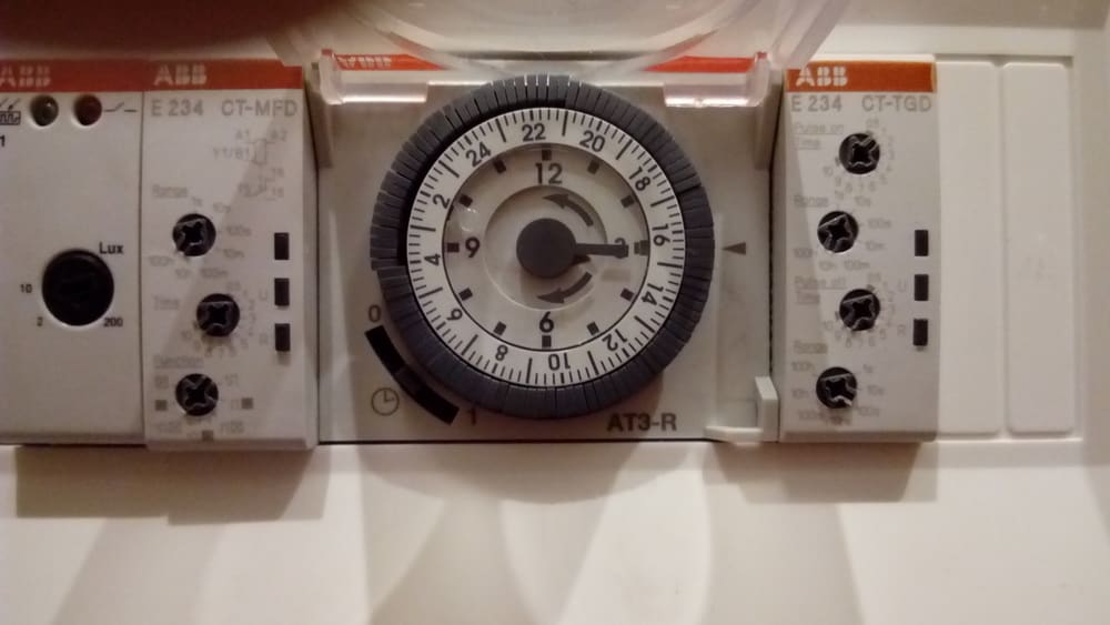 Здравствуйте! Дом с участком, освещение разбито на три линии... Освещение участка и фасада дома автоматически включалось/отключалось по программе для зимнего периода. Работодатель сказал настроить на лето, чтоб позже вкл и раньше выкл. Посмотрев ютуб с трудом нашел как настроить AT3-R, выставил вкл/выкл с 21-00 до 04-00. Подходит время, программа на AT3-R срабатывает, освещение ландшафта и фасада дома включается, НО через минут 10 все вырубается!? На следующий раз, открыл щиток и наблюдал... В выставленное на включение время, начинают работать три реле, на Т1 и CT-MFD загораются зеленые индикаторы, через несколько минут срабатывает реле времени CT-TGD, зеленый диод часто мигает и с низу оранжевый подмигивает. Как писал выше - при его включении освещение вырубается.