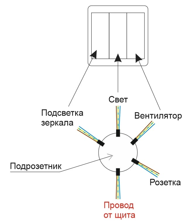 Здравствуйте. Вопрос к электрикам. Помогите пожалуйста разобраться с проводкой, как подключить все провода к трех кнопочному выключателю в ванной комнате? Схема прилагается.