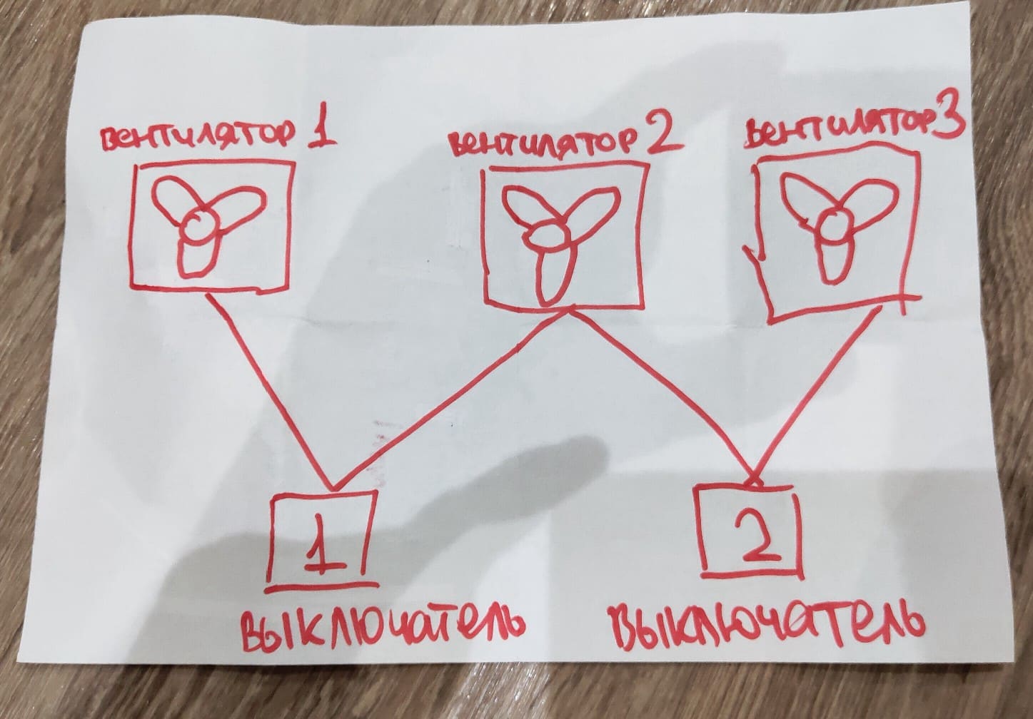 Три ряда светильников меняем на три вентилятора. Схема из второго сообщения. Два реле. Что Вам ещё нарисовать? Поменять лампочки на моторчики?