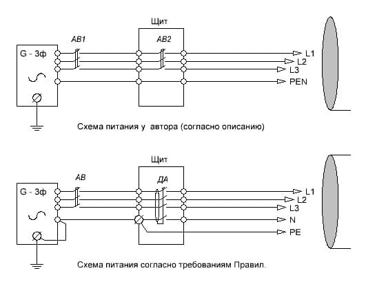Проверьте обязательно и ... еще раз, уже на выходе поставьте перемычку на "нейтраль" и "землю". Отлично, что кабель пятижильный!RuslanK писал(а):Источник цитатыНоль в генераторе тоже соединен с землей (90% но не 100 - еще проверю). Т.е. кабель 4 жильный.