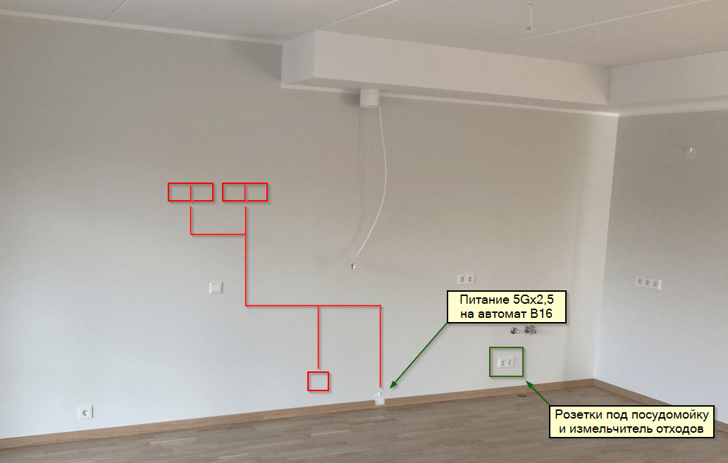 Необходимо добавить ещё 5 розеток для встроенной техники (4 за пеналами и одна снизу для встроенной морозильной камеры).