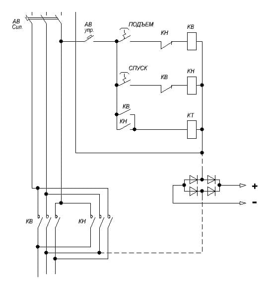 Проблема скорее всего, в цепях питания контактора КТ ... но мы не знаем ... может обошлись без контактора ... пунктирные линии - питание выпрямителя без контактора.