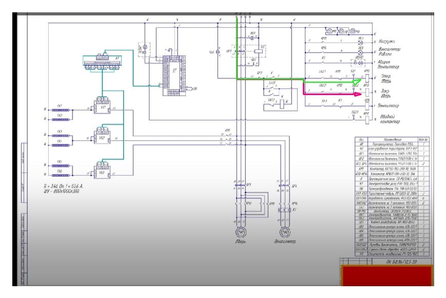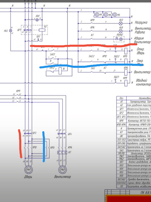 Спасибо большое за ответ! Сейчас пытаюсь сообразить, но что-то всеравно не выходит. Можете пожалуйста буквенно указать, что через что проходит 6а автомат - это который Qf2? и как он сразу идет на галечник? (переключатель на 3 положения SQ1.1? ) разве он не должен пройти перед этим промежуточное реле? Или показать красной линией откуда начинаем читать и в каком направлении движемся. (Не могу сообразить просто откуда начинать прослеживать). Буду очень благодарен.МБВ писал(а):Источник цитаты Делов то. Шестиамперным автоматом подаем напряжение на галетник, тот через промежуточное реле и концевики хлопает пускателями для реверса мотора с контактами блокировки от дебила, который на все кнопки жмет.