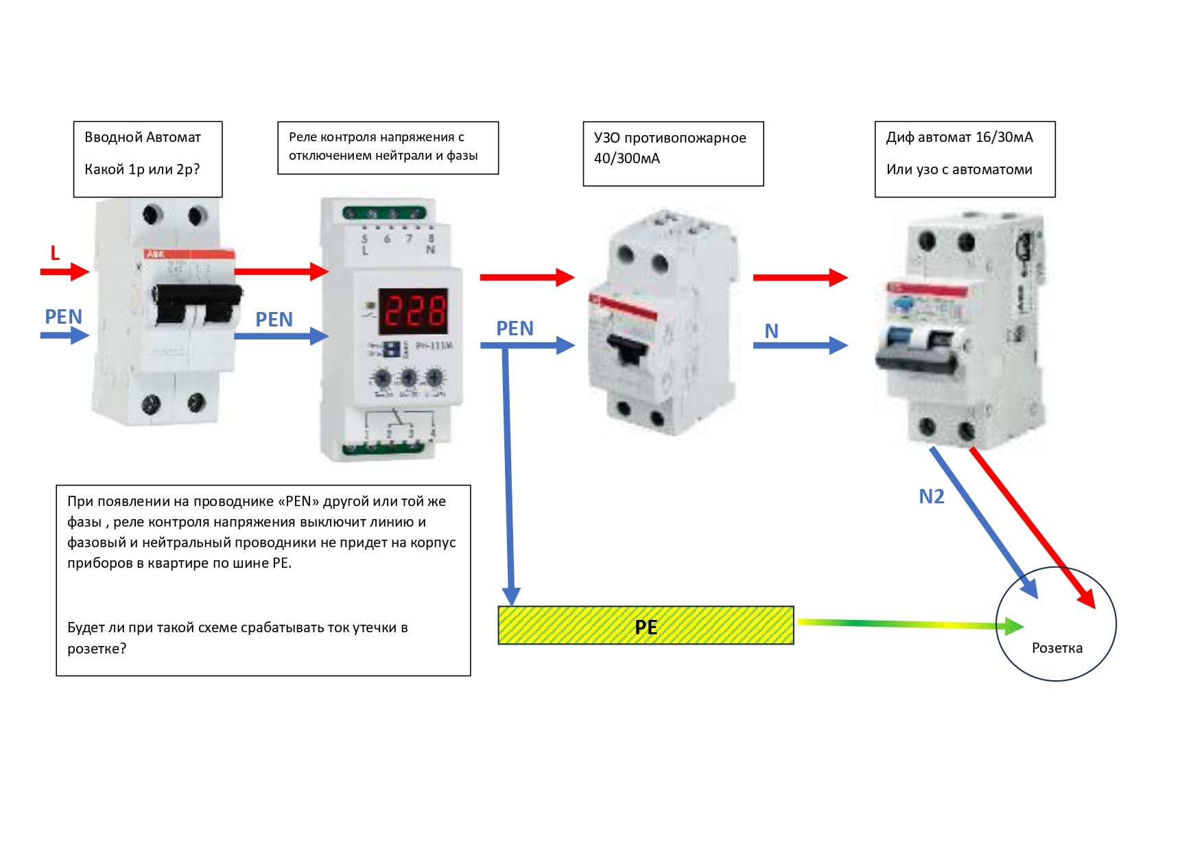 НО! ПУЭ говорит что разрывать НОЛЬ можно только одновременно с ФАЗОЙ, например, когда сдвоенные рычаги на автомате. В электронном Реле контроля напряжения, который я устанавливаю эта функция поддерживается, но если вдруг залипли контакты реле по ФАЗЕ, тогда НОЛЬ разорвется , а Фаза будет подключена. И тогда, например, при включенном обогревателе на Нуле появиться фаза.