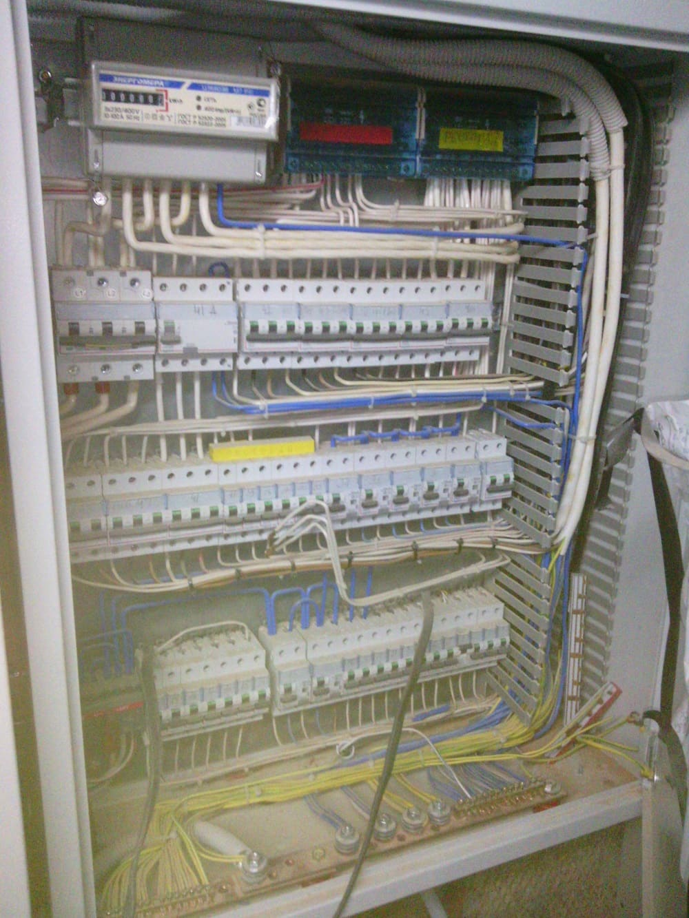 Мои щитки, сильно не пинай,главный щит потом сделал за оргстеклом, применял Шнайдер(карточная система квартир,побоялся доверить картридеру с его требованиями) контакторы,землю с нулем соединил(выгорит ноль, будет время, если что...)(когда был в учениках,меня учили что Ноль делать перемычку на землю, Ваше мнение, отпишитесь),перекосов фаз пока нет,сидел на калькуляторе...высчитывал нагрузку.