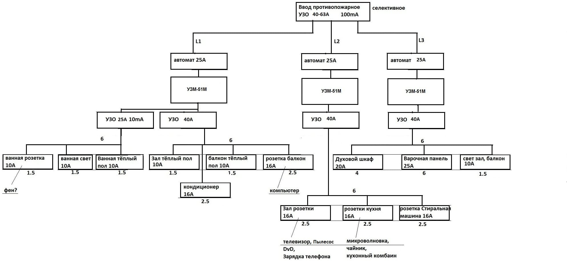 Кактус писал(а):Источник цитаты Jokk, Ну однофазка, значит однофазка. Тогда меняем АВ25А на АВ 32А, а на линии L1 перед УЗО 25А10ма ставим АВ16А (можно и 20А) и кабель на розетку ванной 2,5мм2, ещё бы поменял местами кондей+т/пол балкон на розетку ПММ.