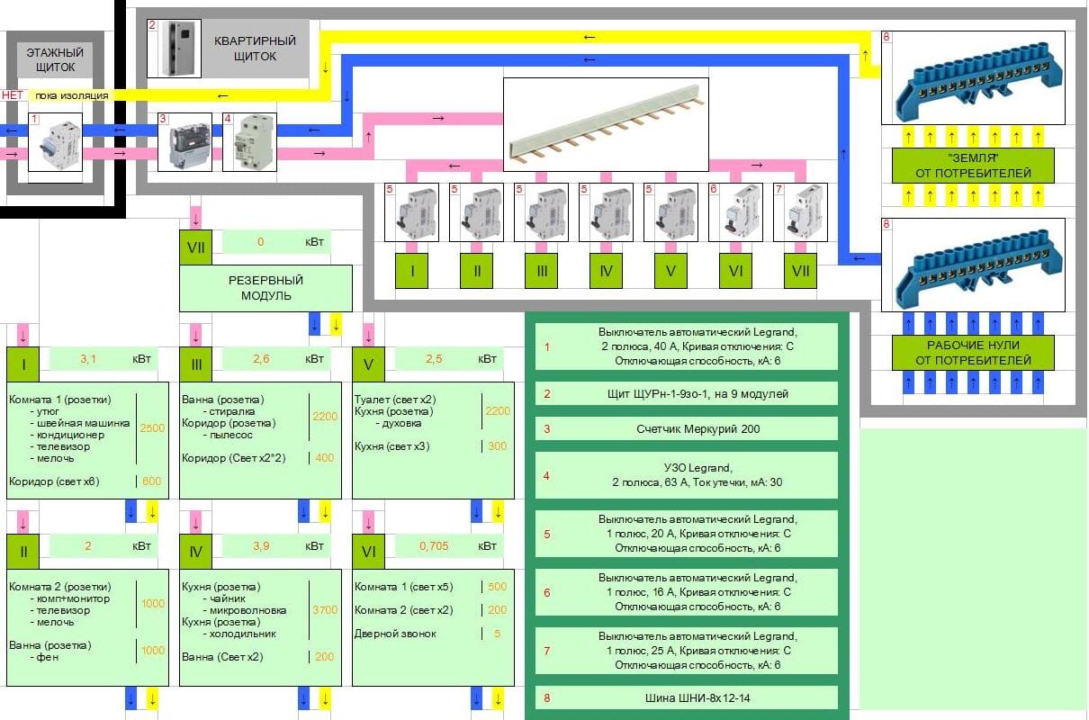 [quote="Consigliere"]Источник цитаты кросс-модуль 4х7[/quot Крос-модули нафиг не нужны. Схему щитка проработайте получше тк автоматы в 25 А это многовато для ВВГ 3х2,5мм кв и тем более много для ВВГ3х1,5мм.кв. 10-16А на розеточные группы и от 1А до 6А на освещение будет надёжнее. Кабель ВВГнг даже гостовский не всегда соответствует сечение, а если по ТУ, а тем более по заказу изготовлен, то лучше вообще не рисковать. Да и условия прокладки и длину с динамикой возможного роста нагрузки кто расщитал? Мне никогда не нравились схемы щитков с УЗО на вводе тк при его срабатывании вырубается всё с освещением. Если финансы позволяют то на каждую розеточную группу поставьте дифы 64 серии с дифференциальным расцепителем не более 30mA, а освещение вообще без узо через автомат запитайте. На освещении вообще редко узо ставят и на то своя веская причина должна быть. Кроме селективности по тепловым расцепителям необходимо соблюдать селективность по сверхтокам (быстродействующий электромагнитный расцепитель автомата) иначе при КЗ сработает вводной автомат, а групповой нет. Для групповых линий лучше использовать автоматы с электромагнитными расцепителями в 3000 или 3 кА, в крайнем случае 4,5кА (на корпусе автомата мелкими цифрами нанесено) для главных в распредщитках 6000 или 6кА для коммутации на вводе 10 -12 кА. Мне другое не понятно как вы смонтировали электропроводку без распредкоробок? Где соединяли провода на освещении и розеточных групп? Дело в том что соединение проводов вне коробки это грубейшее нарушение СНиПа и ПУЭ.
