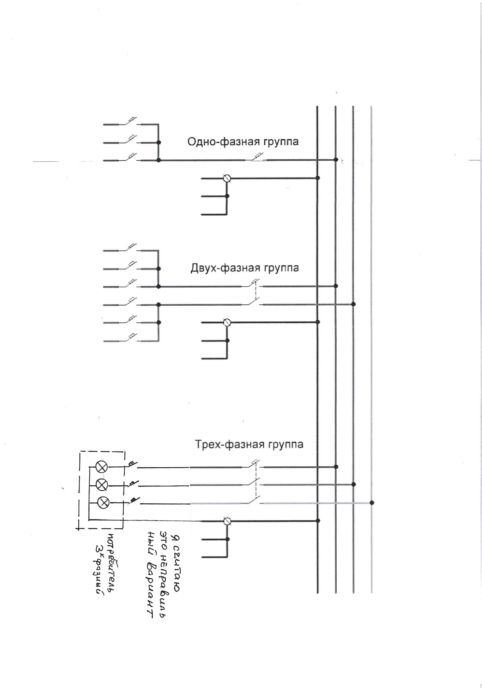 "10.1 Групповые линии освещения могут быть одно-, двух- и трехфазными в зависимости от их протяженности и числа присоединенных светильников. При этом в двух- и трехфазных групповых линиях запрещается применение предохранителей и однополюсных автоматических выключателей. ". :pardon: