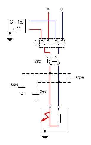 3.Место установки УЗО нигде не упоминается. Похоже, опасен искусственный ноль, возникающий на участке после УЗО, поэтому он должен быть минимальных размеров. Т.е. УЗО должно быть как можно ближе к потребителю, а УЗО сразу после генератора не имеет смысла, и защитить всю линию по всей её длине с помощью УЗО нельзя.