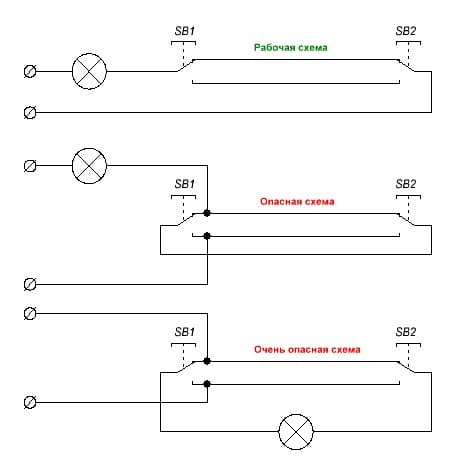 Полностью согласен ...elalex писал(а):Источник цитаты3.Третья схема ("очень опасная") опасна тем, что на неподвижные контакты одного переключателя заходят фаза и ноль, между ними в 5мм-зазоре качелька. Если качелька вылетит со своего гнезда, КЗ.