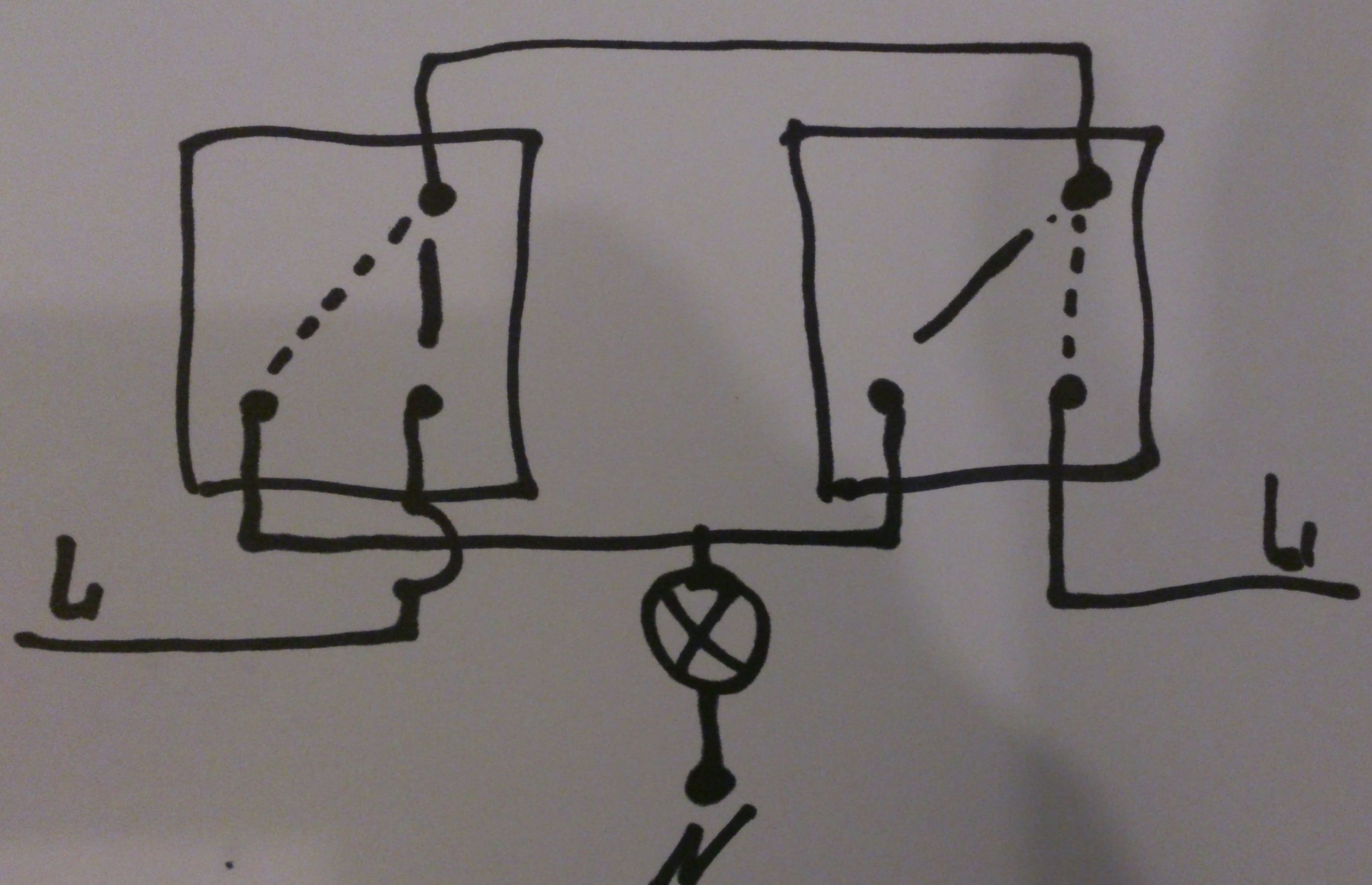 Извините! Перерисовал у себя ... "превратилась" в №2. Возможно ввело в заблуждение, отсутствие явно указанной фазы и нуля.Кактус писал(а):Источник цитаты Тогда вот вариант №4 подключения проходных, если не проброшен 4-й провод. Только фаза должна заходить на оба проходных выключателя.