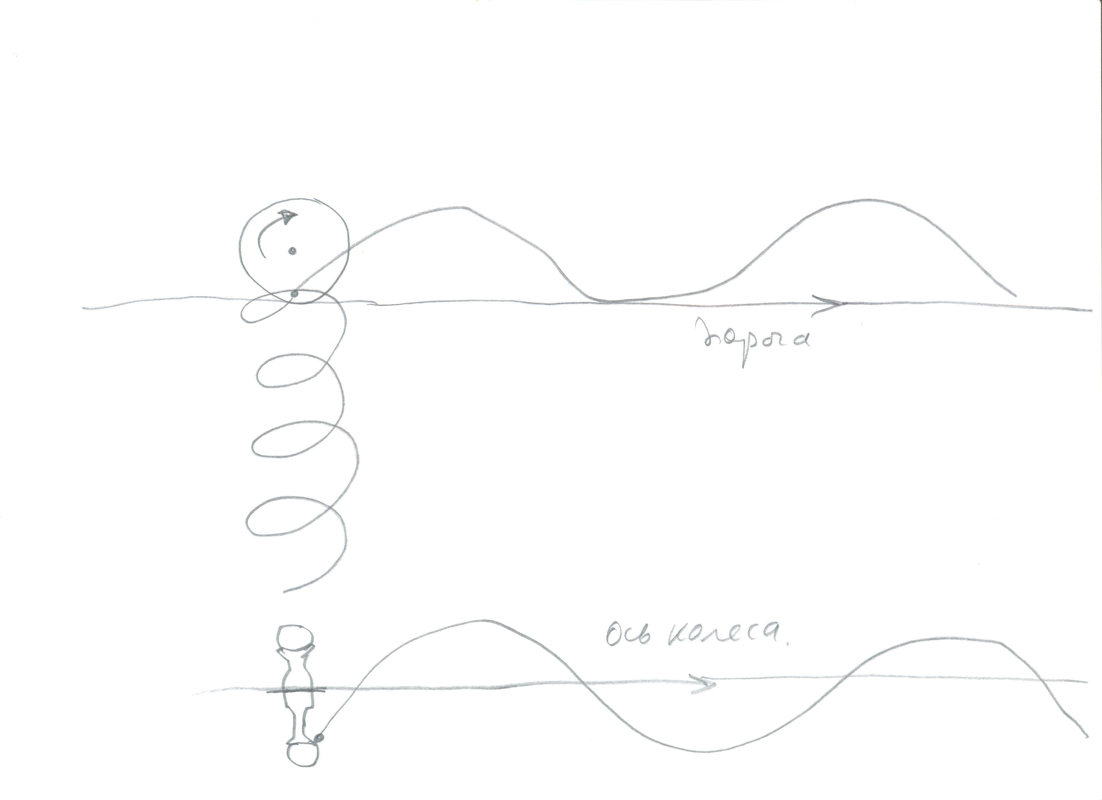 Но даже если изобразить график скорости перемещения точки, то это тоже будет синусоида, с той лишь разницей, что на рисунке ось колеса совпадёт с уровнем дороги.
