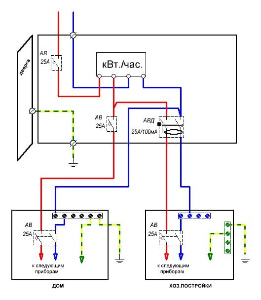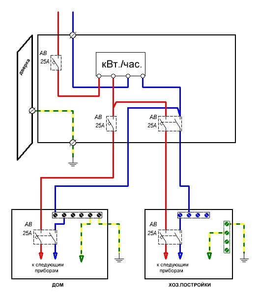 У вас, выполнено повторное заземление PEN проводника на вводе перед АВ ( который стоит перед счетчиком) . Дальше, у вас должен идти N проводник после этого автомата. С учетом, что это N проводник, автоматы стоящие после счетчика не противоречат нормам. А вот уже на щитках дома и хозпостройке, вы снова делаете повторное заземление, Чего N проводника ? Или PEN проводника. Если N проводника то это не верно, так как он уже не должен быть связан с землей. Если PEN проводника так так же не верно , так как в PEN проводнике не должно быть коммутационных аппаратов.