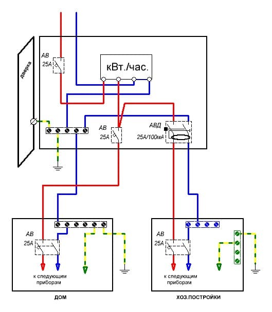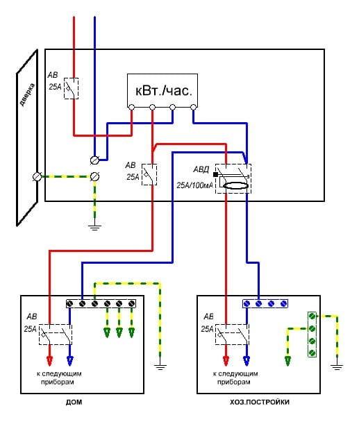 2. В РЩ дома уберите повторное заземление нейтрали. Туда как и в хоз постройки уже должно тянуться РЕ отдельным проводником.