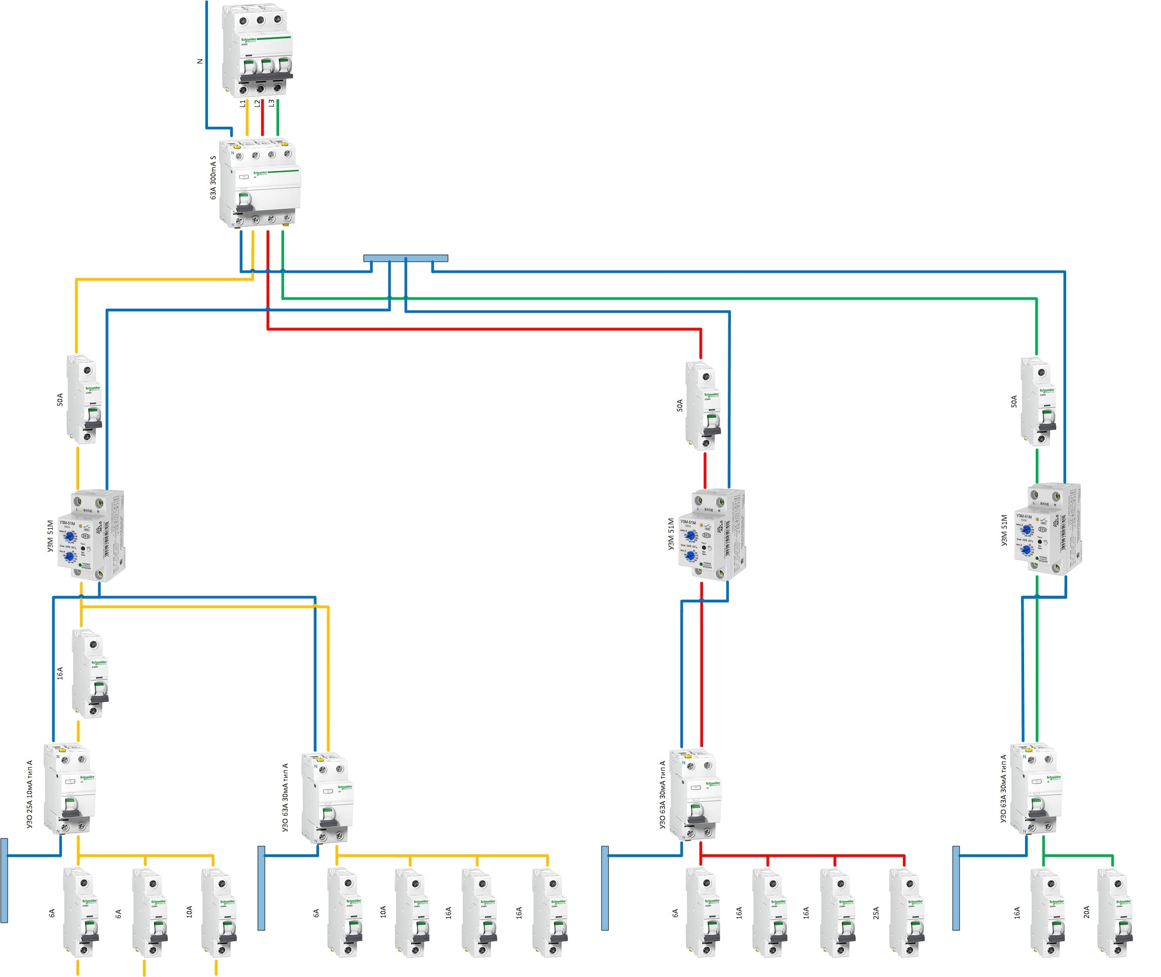 .Кактус писал(а):Источник цитаты Jokk, Добрый день. Вы не указали номинал вводного АВ 3Р или это ВН? Точно нужно знать какого сечения у Вас кабель от стояка и далее. Если это допустим 5*6, то при ваших АВ в 63А (на вводе) и 50А далее - фактически Вы можете перегрузить кабель и нагрев его это пол беды, а вот если загорится......Поэтому на 3-х фазном вводе при жиле 6мм2 ставят АВ на 25А (т.е. прибл. 5,5кВт на фазу) и никак это не зависит от того сколько Вам чего выделили - Может Вам и 50кВт выделят, но при кабеле 5*6мм2 увы больше 27кВт при питании 220*3 Вы забрать не сможете - погорят кабеля. Я бы вернулся к предыдущей схеме viewtopic.php?p=8301#p8301 и прорабатывал бы её с нижеуказанными рац. предложениями. Но первоначально нужно точно знать какой кабель кинут от стояка.