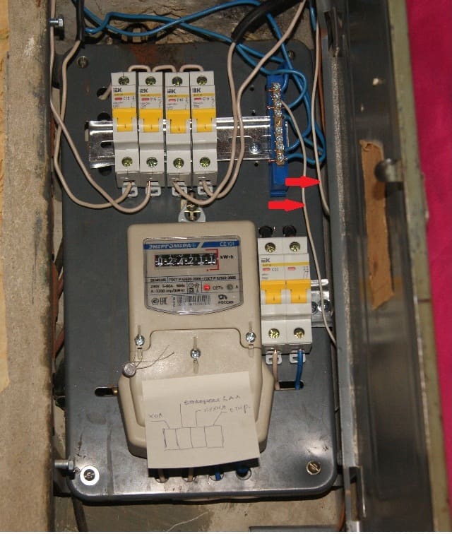 Это один и тот же провод. Когда-то давно был подключен дверной звонок. Он давно отключен, но на нулевой шинке провод остался. Звонок электронный с трансформаторным питанием. Второй провод никуда сейчас не подключен. Сам звонок на стенке на гвоздике висит.