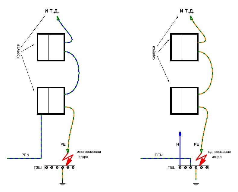 tupos писал(а):Источник цитаты В прошлом году переводил 1 стояк многоквартирного дома на TN-C-S прокладкой дополнительного РЕ проводника и установкой доп. шин в этажные щиты. При первом присоединении к заземляющему устройству всех корпусов этажных щитов была нехилое искрение, даже сажа осталась на шине РЕ. Ради интереса еще раз попробовал: отсоединил и снова присоединил РЕ-проводник к ЗУ, искрения больше не повторялось.