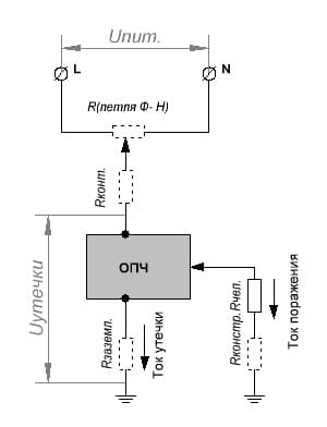 токи утечки (Iут.) и поражения (Iпор.)сильно зависят от величины сопротивления контакта (Rконт.) и сопротивления конструкций (Rконстр.), через которые происходит соединение с землей.