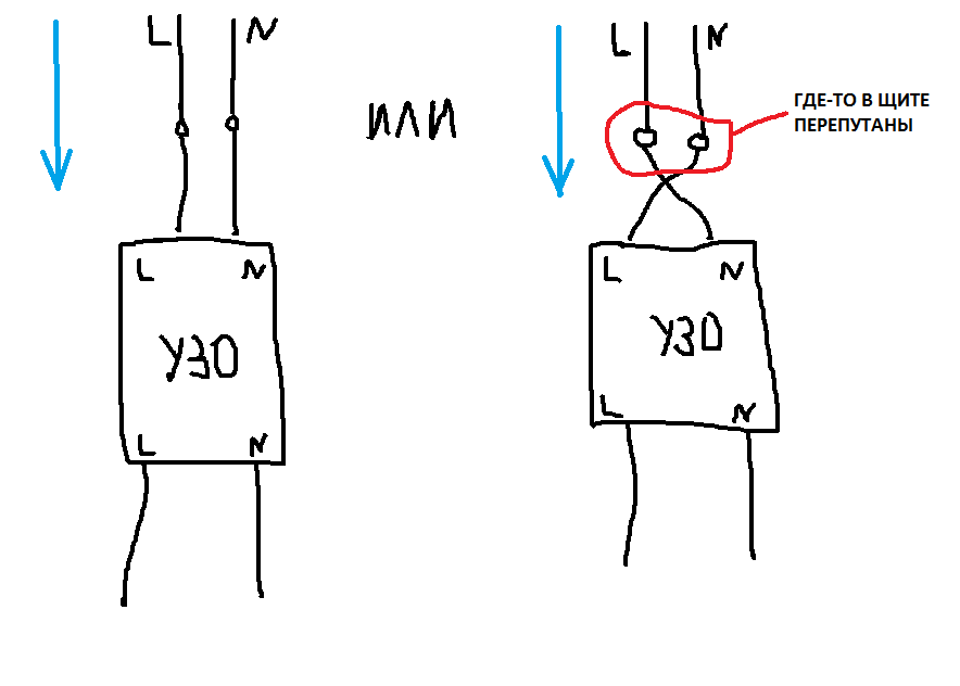 1. При смене полярности как на второй картинке УЗО сработало кнопкой Тест .