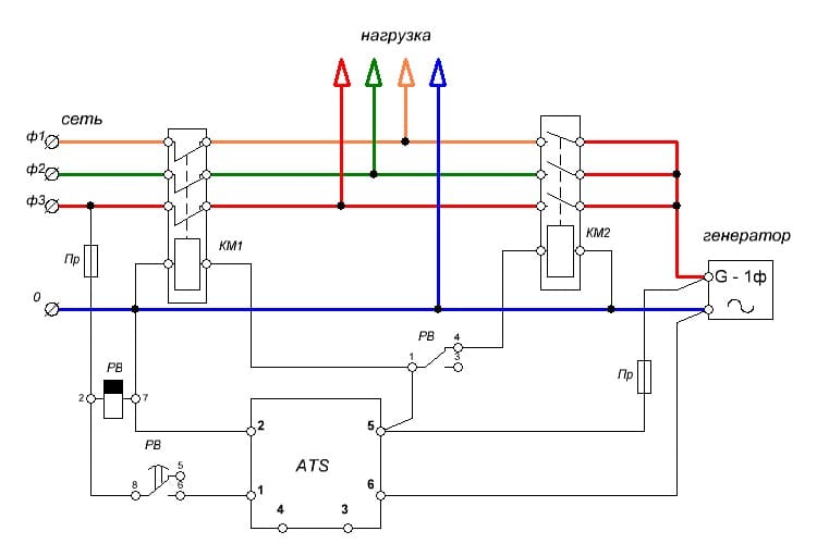 4. ATS - глушит генератор - КМ1 выключается - напряжение сети пошло на нагрузку.