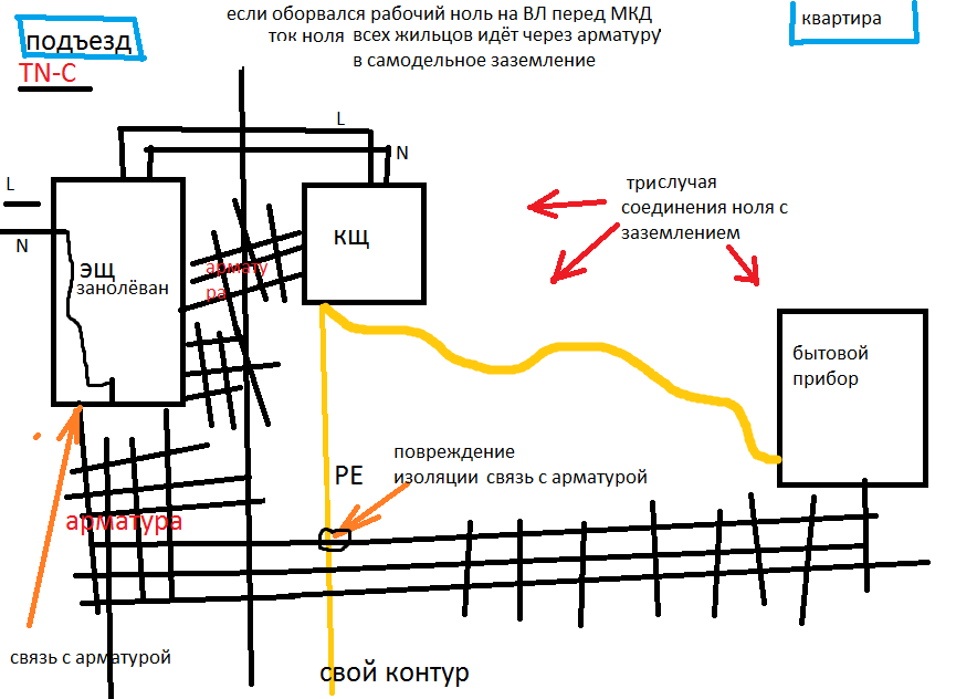 Как ранее обсуждалось, своё собственное самодельное заземление в МКД не совсем безопасно по причине хоть практически редкого ( хотя где как - бардак часто встречается ), но теоретически возможного электрического контакта своего заземляющего проводника с рабочим нолём ( например, вследствие повреждения изоляции своего заземляющего проводника или при контакте заземлённого на свой контур своего оборудования с одним из занулёванных ЭЩ ( которые врезаны в ж/б стену ) посредством вездесущей и торчащей арматуры)) при обрыве рабочего ноля. В таком случае, весь ток рабочего ноля жильцов МКД пойдёт по своему заземлению , что приведёт к пожару и пошаговому напряжению возле своего контура заземления. Если я не прав обоснуйте подробно почему. Ведь живя в МКД нельзя создавать аварийных ситуаций от которых могут пострадать другие. Вобщем, по правилам нельзя при одной системе заземления делать другую, в частности своё ТТ. Тормоз ранее тоже об этом писал. В чём я не прав ?
