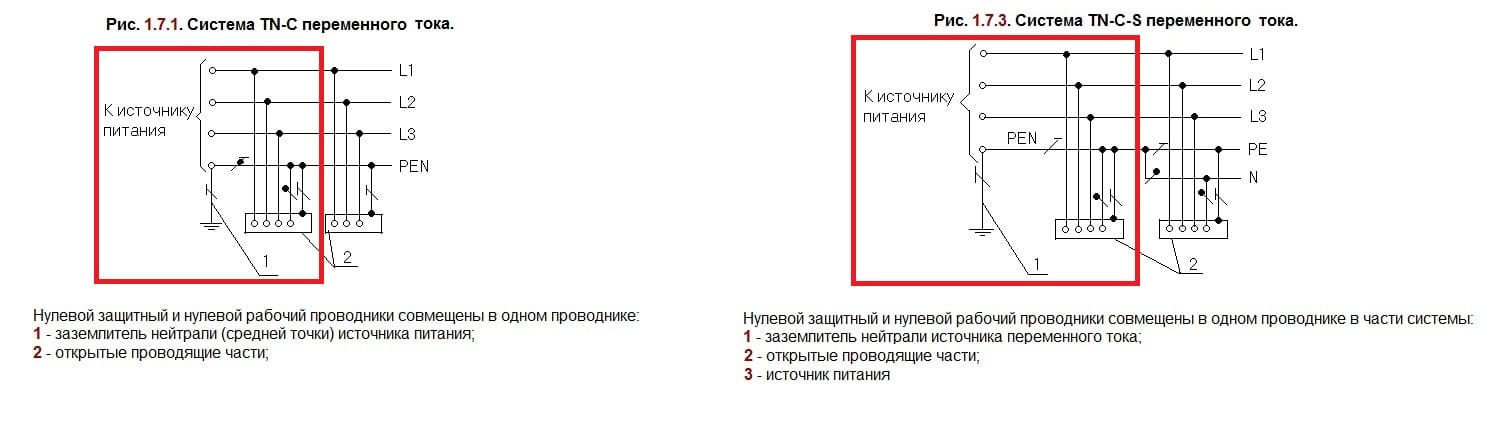 Отличаются - на рис 1.7.1. потребители запитаны по системе TN-C , а на рис. 1.7.3. показан первый потребитель запитанный по системе TN-C , а второй после разделения по системе TN-C-S ( Это тот , который не указан в квадрате) , как это можно не заметить?