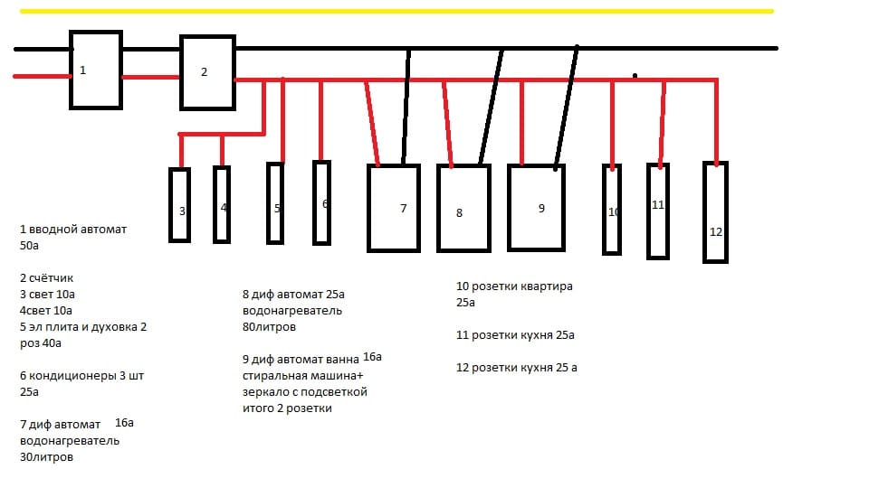 из нагрузки по комнатам. это в каждой комнате по ноутбуку принтеру телевизеру и видеоприставки. остальные розетки свободны в них планируют тыкать зарядки для мобильников утюг и пылесос при надобности. в каждой комнате по кондиционеру. кухня как всегда нагружена блендерами чайниками микроволновкой и посудомойкой. имеем 2 туалета и два водогрея в каждом туалете один 80л 2.5киловат и 30 литров 2 киловата.