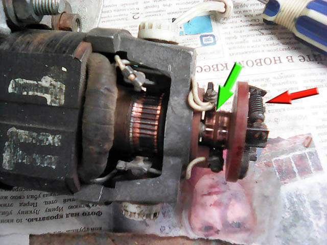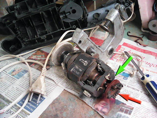 работает от 220Вт, обороты и мощность, похоже- то, что нужно. Маркировки никакой нет.Беда в том, что торчит у него сзади какой-то токосборник (зеленая стрелка) подсоединенный к рабочим щеткам и текстолитовая шайба со спиралями (красная стрелка) и они то уже не вписываются в габариты корпуса ЛШМ. Можно ли безболезненно удалить хотя бы текстолитовую шайбу или, все же, делать у корпуса аппендикс?
