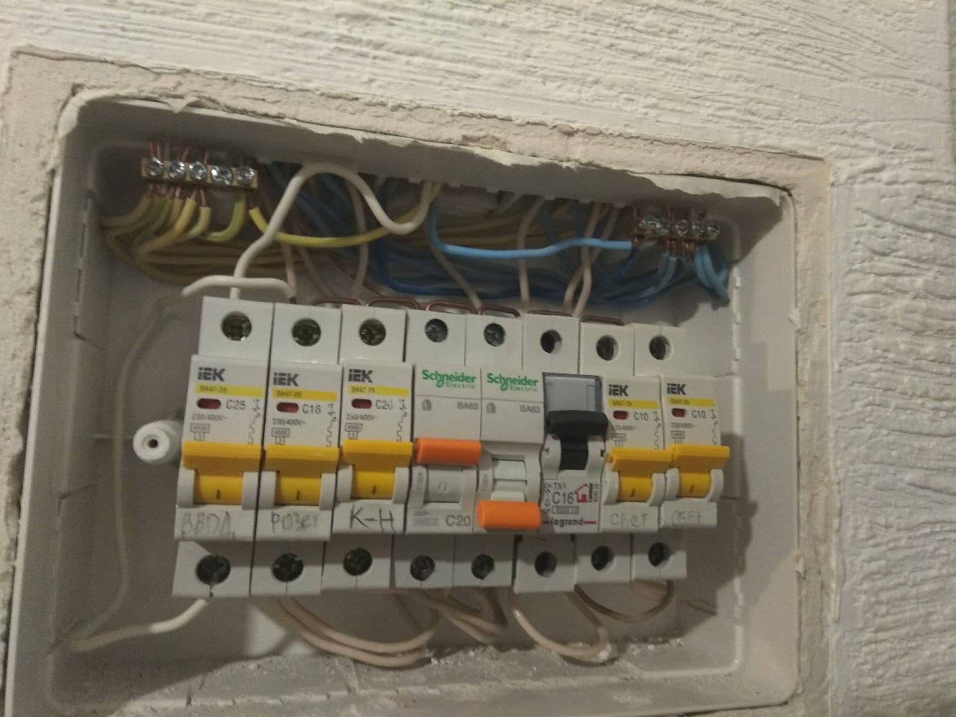 Вопрос нужно ли мне что-то менять, а скорее ЧТО ПОМЕНЯТЬ?), для безопасности моей технике, в подъезде автомат iek 40a, свой щиток сфоткал, места в боксе свободного нет, но если надо я думаю можно вырезать под 1-2 модуля(за место креплений,(но не желательно))