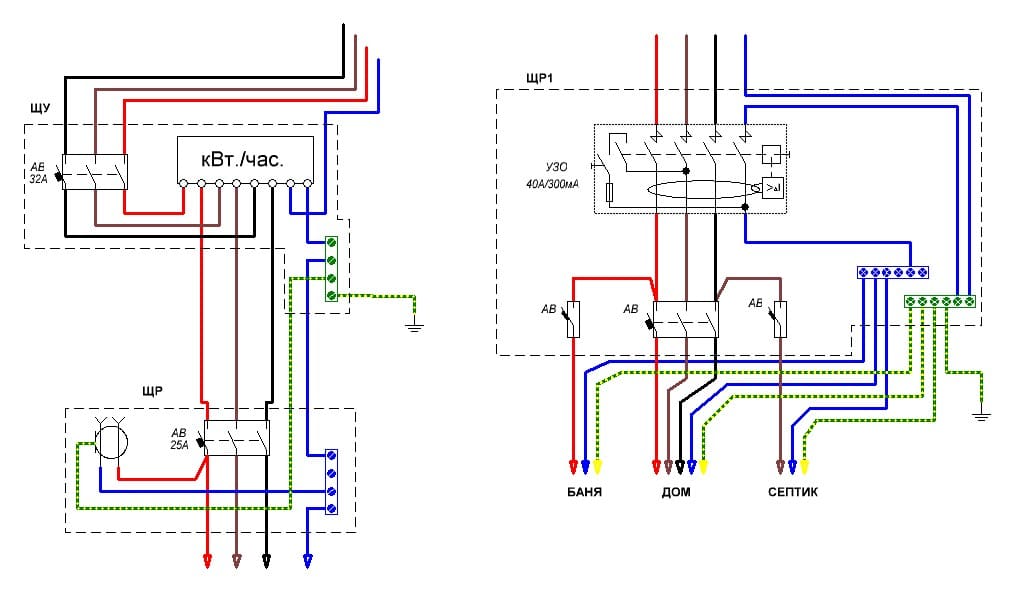 Как я понял - однофазка. Тогда схема типа такого ...Кабели на баню, септик и ворота пойдут 3-х жильные.