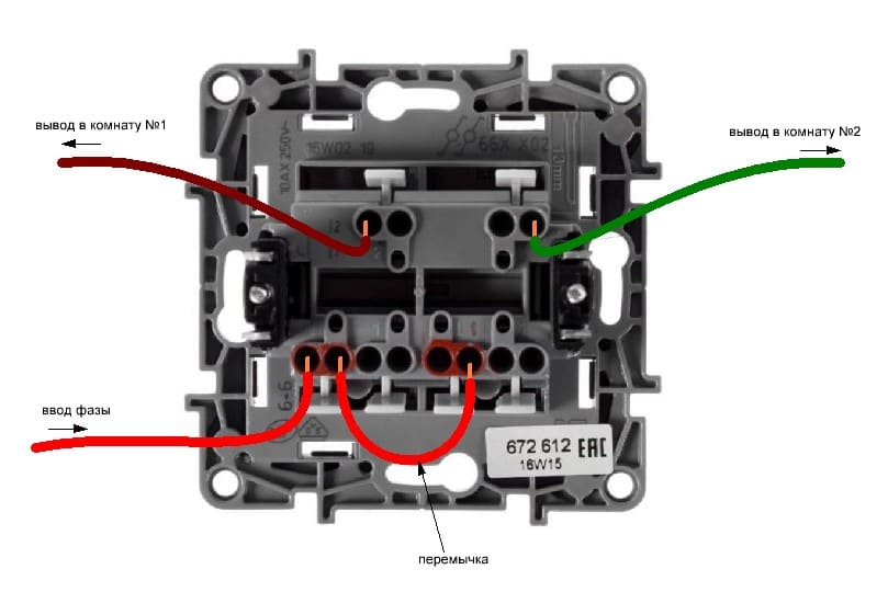 Имеется фаза и 2 провода на 2 комнаты. Перемычку на 2F использовал.