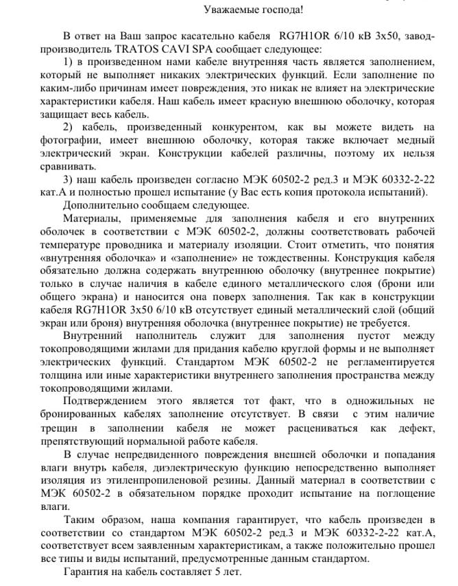 К нам, на предприятие химической промышленности, поставили кабель с изоляцией из этиленпропиленовой резины производителя TRATOS марки RG7H1OR 6/10кВ 3х50. Общая длина 980м. Подрядчик смонтировал несколько ниток кабеля. При монтаже концевой муфты на кабель, а именно снятии наружной оболочки, установлено нарушение целостности наполнителя по всей длине. Нарушение заключается в продольных трещинах перпендикулярно токопроводящим жилам на всю толщину наполнителя.(фото прилагается). Пригласили представителя поставщиков, зафиксировали повреждения. Поставщик направил письмо (во вложении) в котором указано, что кабельный наполнитель не выполняет электрических функций. Мы же считаем, что кабельный наполнительнесёт гидрофобную функцию, и в последующем при возможных повреждениях внешней оболочки, вода может попасть на токопроводящие жили, что может привести к аварийному выходу из строя всей линии - при температурных расширениях воды, воздействия среды на этиленпропиленовую изоляцию токопроводящих жил и т.д.
