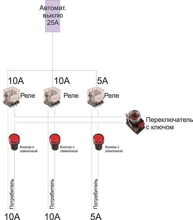 на входе в ящик стоит автомат на 25ампер (включен будет всегда, выключение станка будет через ключ и кнопки на дверце), от него идут три параллельных реле (10+10+5А). Каждое реле включаются переключателем ключом + одним кнопочным переключателем соответствующей группы. Т.е. сначала ключ повернуть нужно, а потом соответствующую группу кнопкой (с фиксатором).