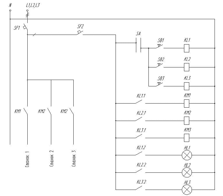 4. KL1,2,3 - ваши реле, KM1,2,3 - пускатели (контакторы). Провода с реле идут на управляющие контакты если что, хотя текстом это не воспринять, лучше погуглите.